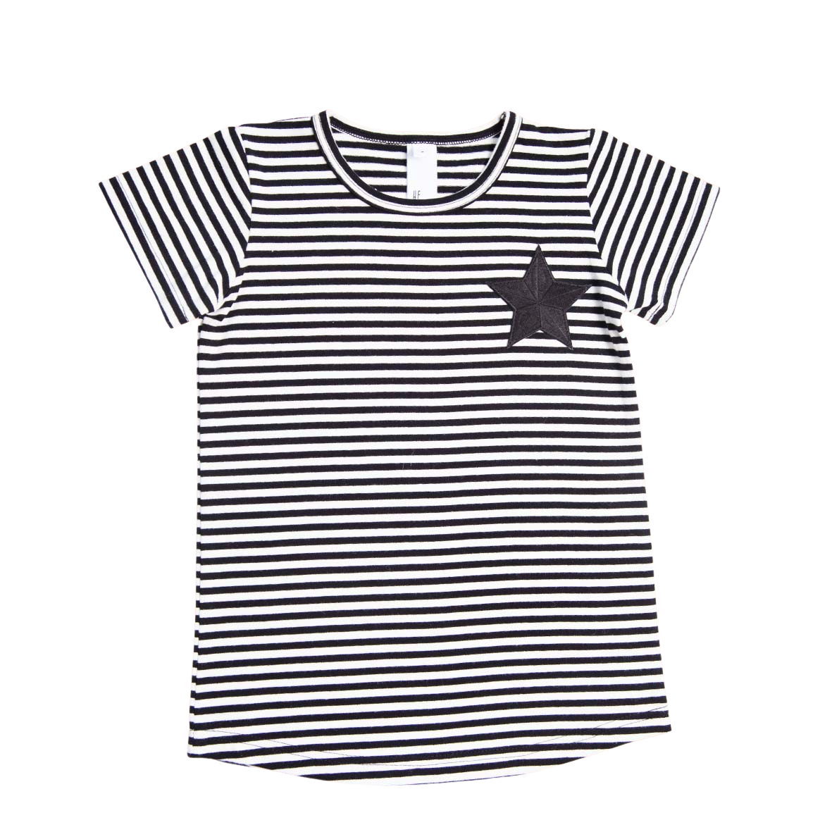 Easy, breezy style in this classic black and white stripe featuring the cutest little embroidered black star patch.