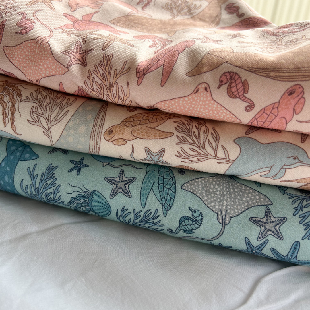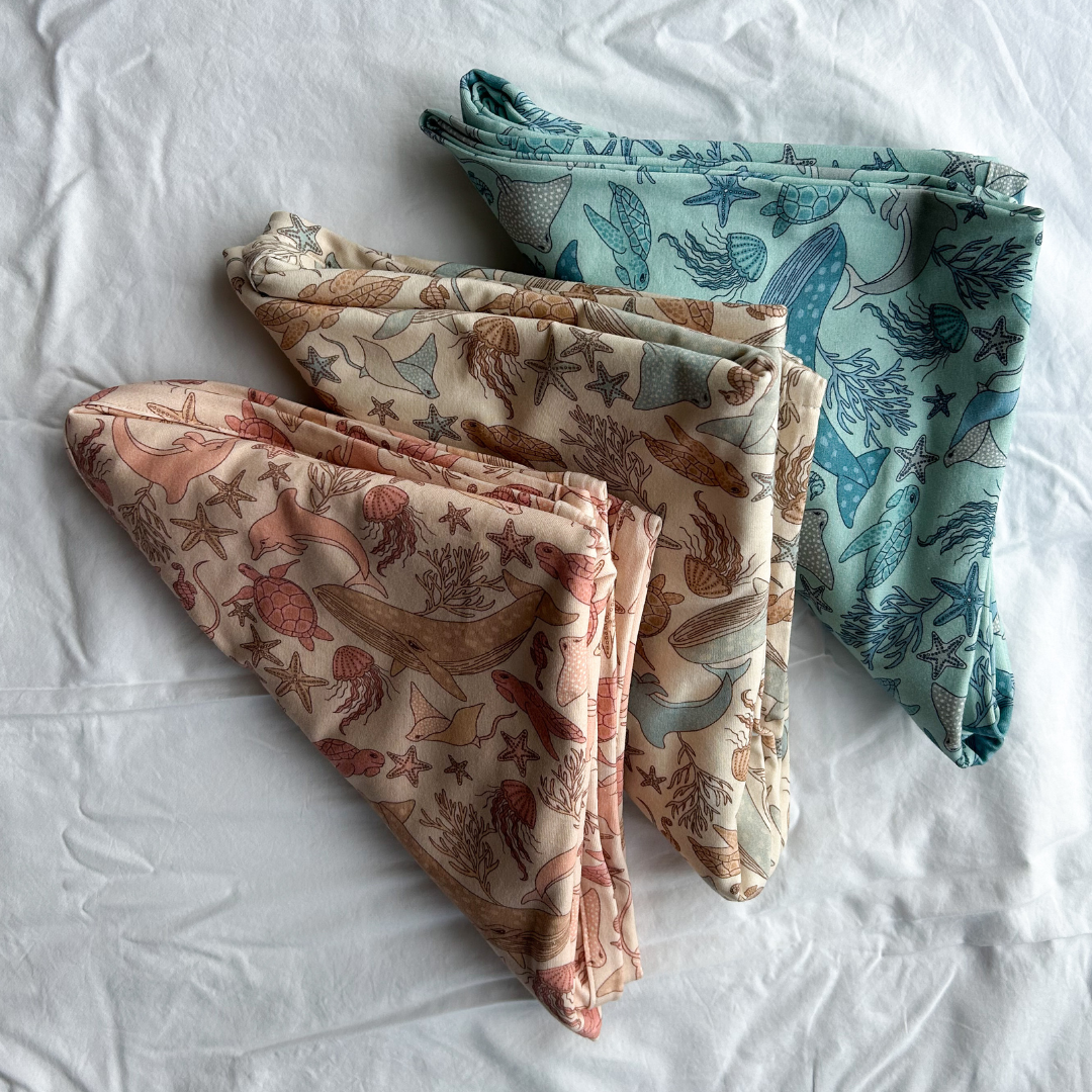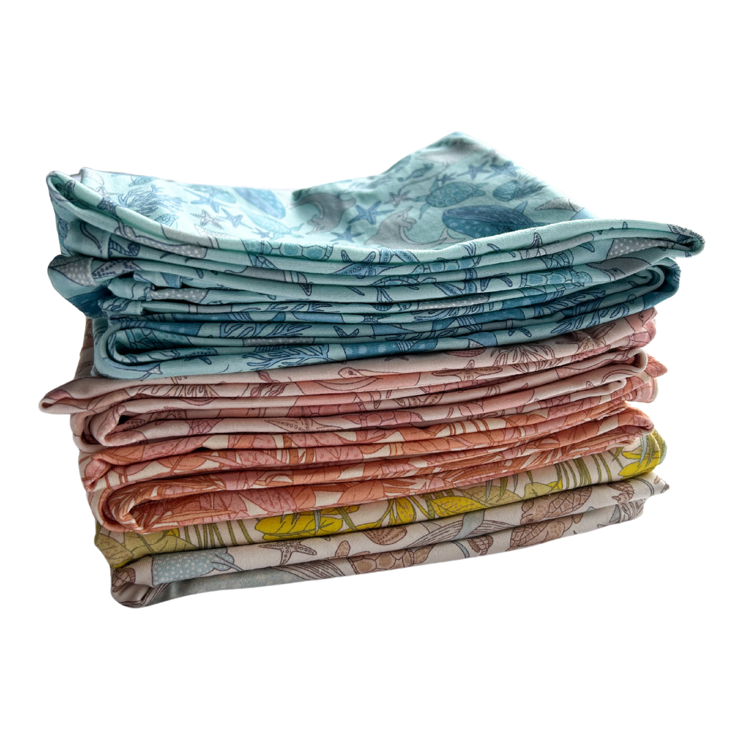 Available in five of our stunning new prints, including sea creatures blue, sea creatures shell, sea creatures blush, rainforest sherbet, and rainforest yellow. Take your pick or bring home a couple to always have one on hand.