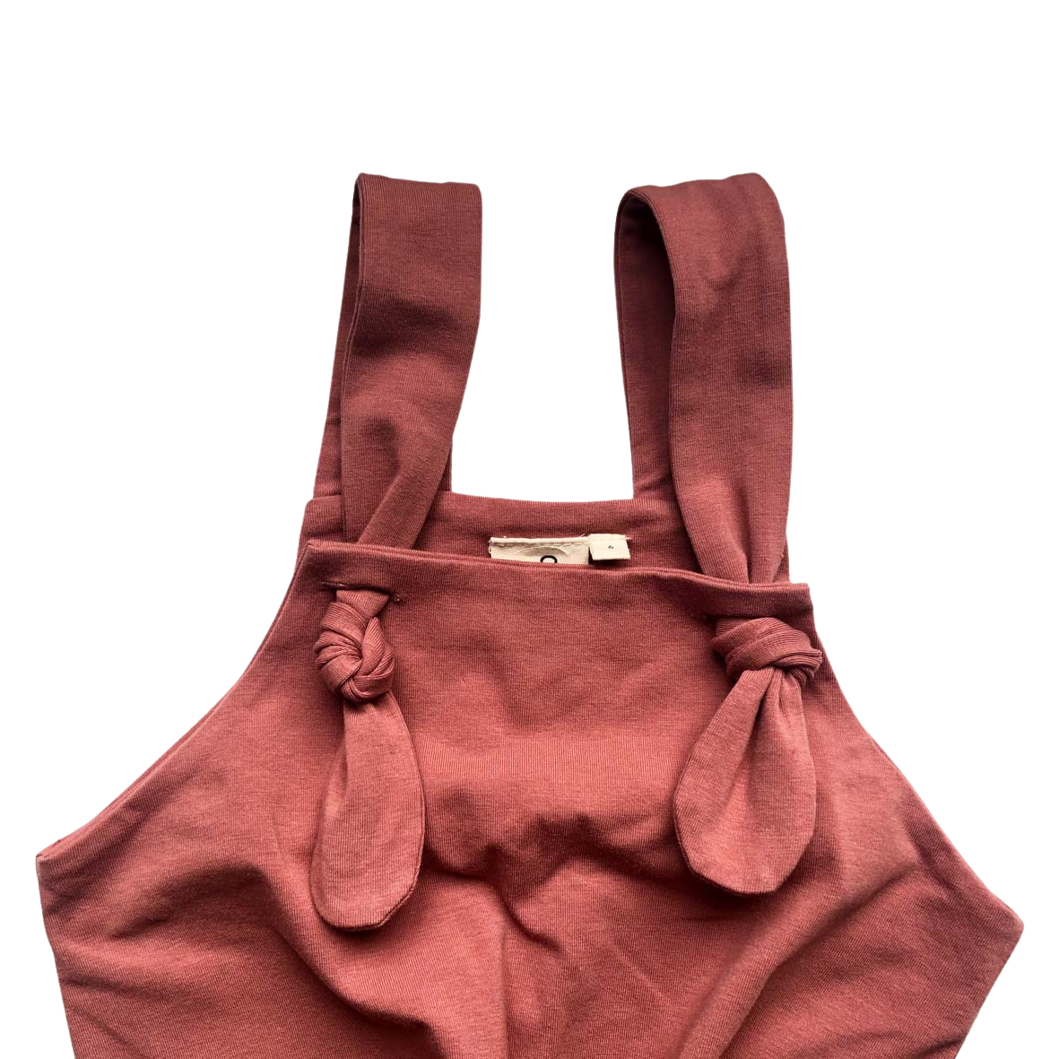 These overalls are cut with a short leg that sits above the knee, a loose fit through the body so that they can be easily pulled on and off like a pair of pants, and tie up straps at the chest for easy and adjustable dressing.
